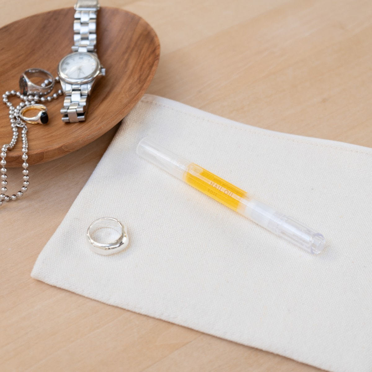 2.オイルが筆に浸み出たら爪、甘皮周り、指先にオイルを塗布します。