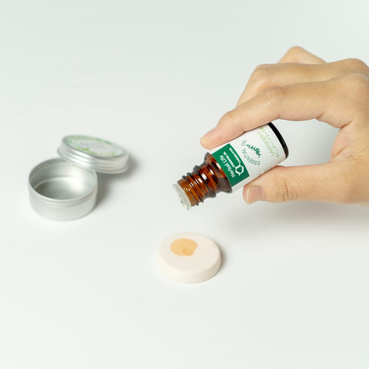 1.スト―ンをアルミケースに入れ、安定した場所に置き、ストーン天面の中心あたりにエッセンシャルオイル(精油)1~3滴をゆっくり落とします。