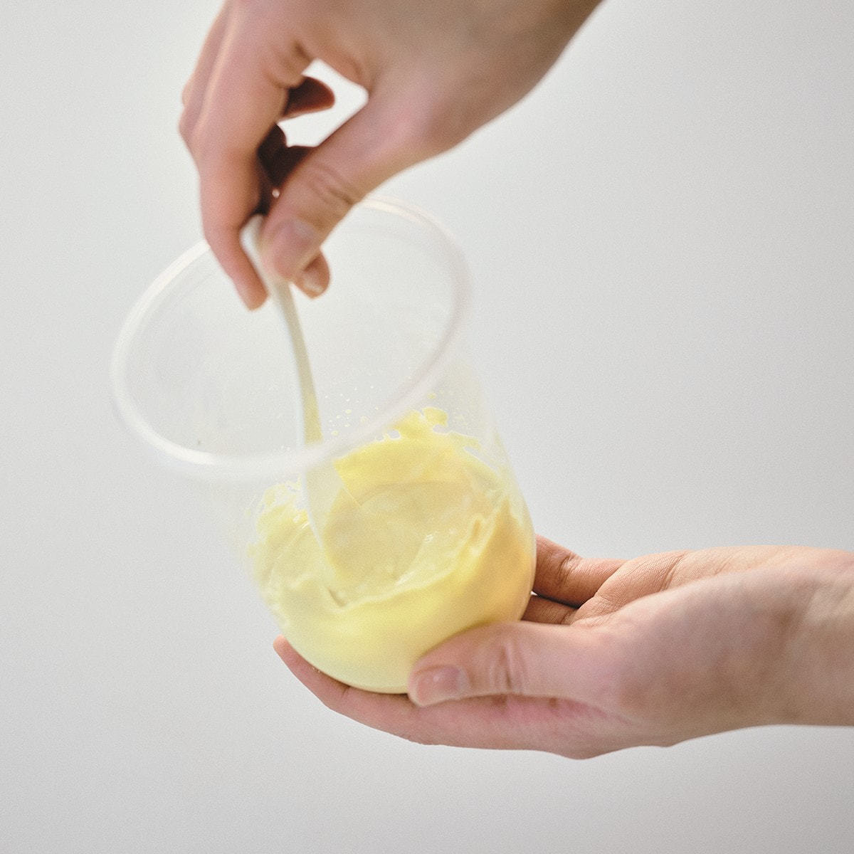 ①シリコンボウル/カップ(適量サイズ)に本品25gをとり、水約60~70mLを加えます。