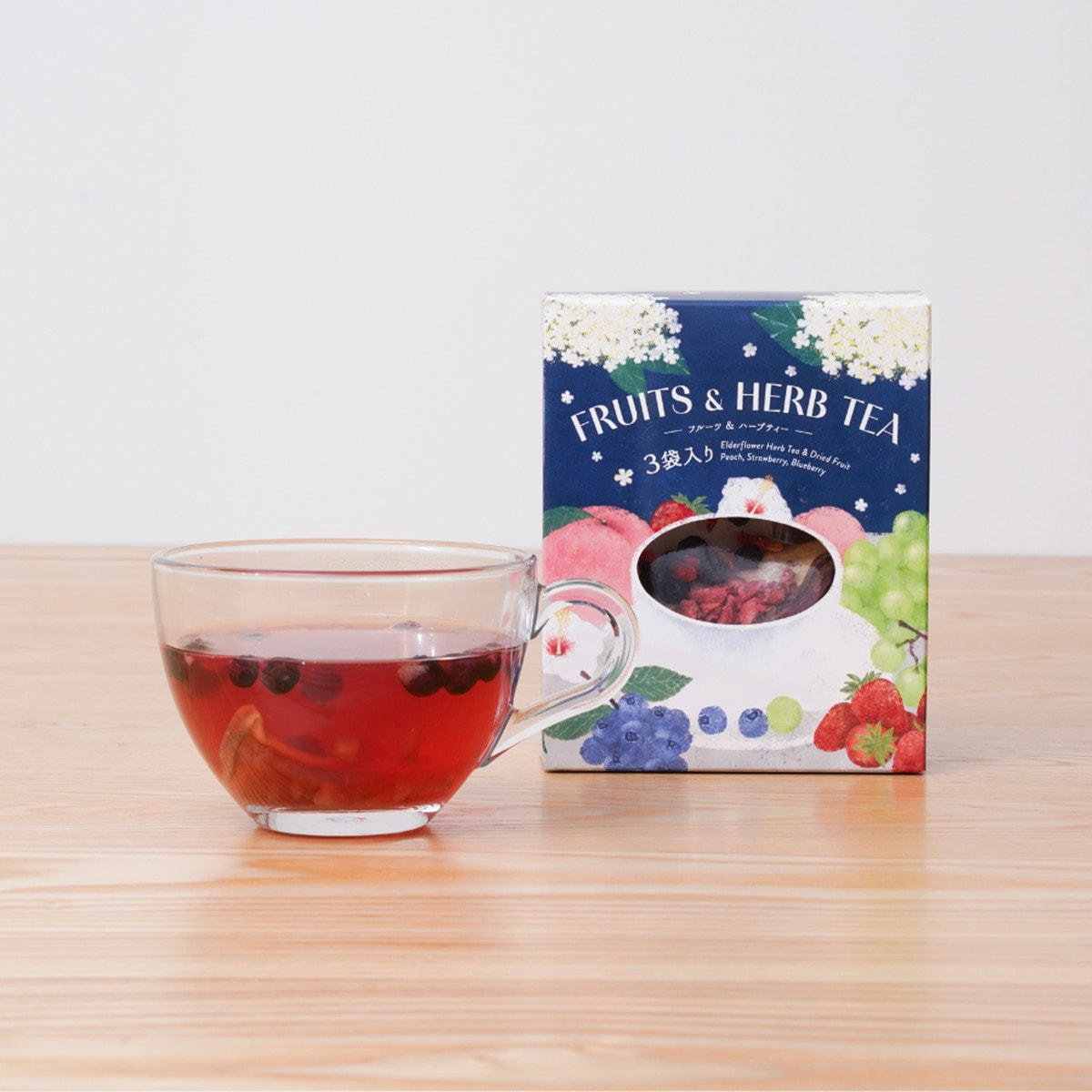マスカット風味の爽やかな口当たりのブレンドハーブティーに、ドライフルーツの色と香りが溶け込みます。