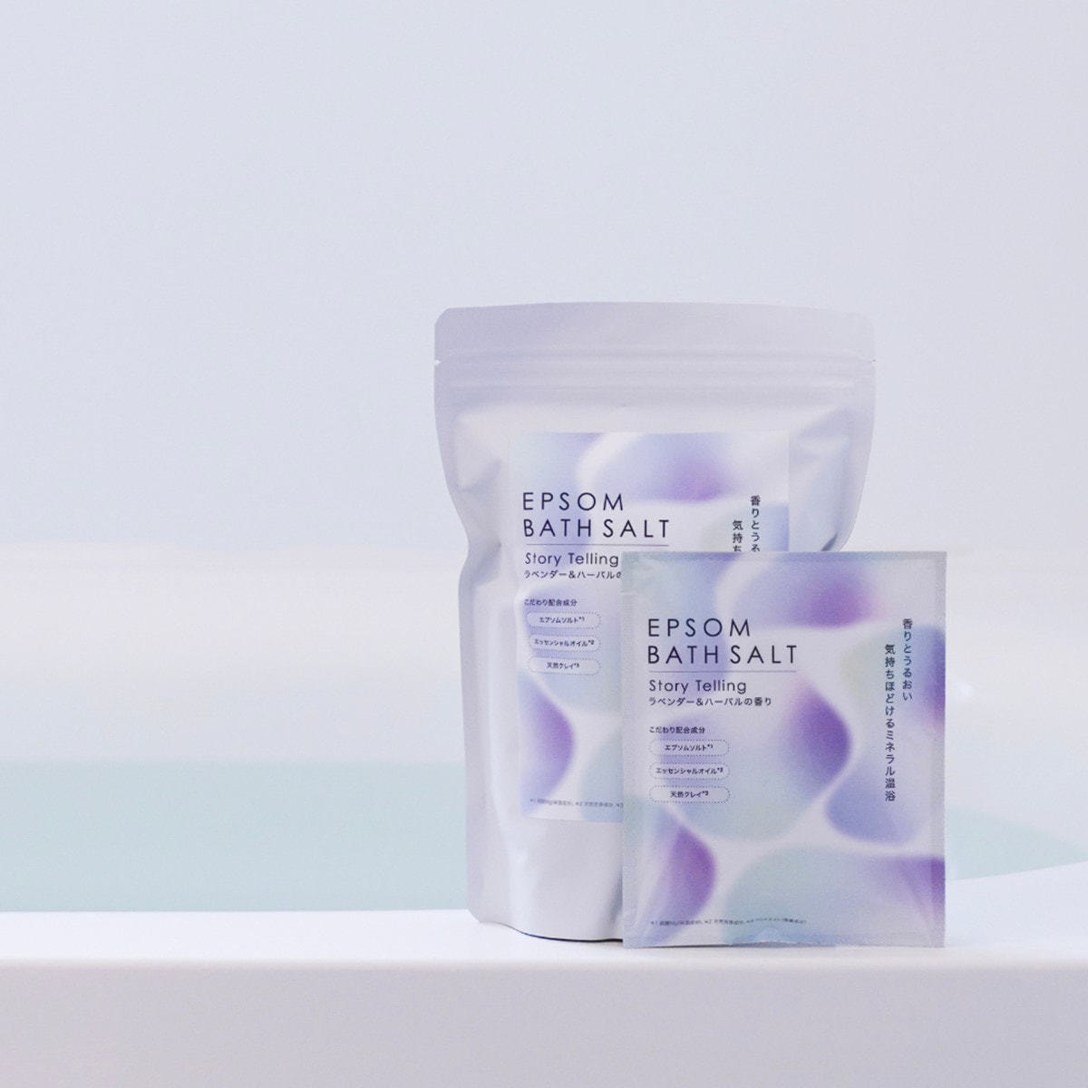 エプソムソルト(硫酸Mg(保湿成分))をメインに、エッセンシャルオイル(天然芳香成分)、天然クレイ(ベントナイト(吸着成分))を合わせました。
